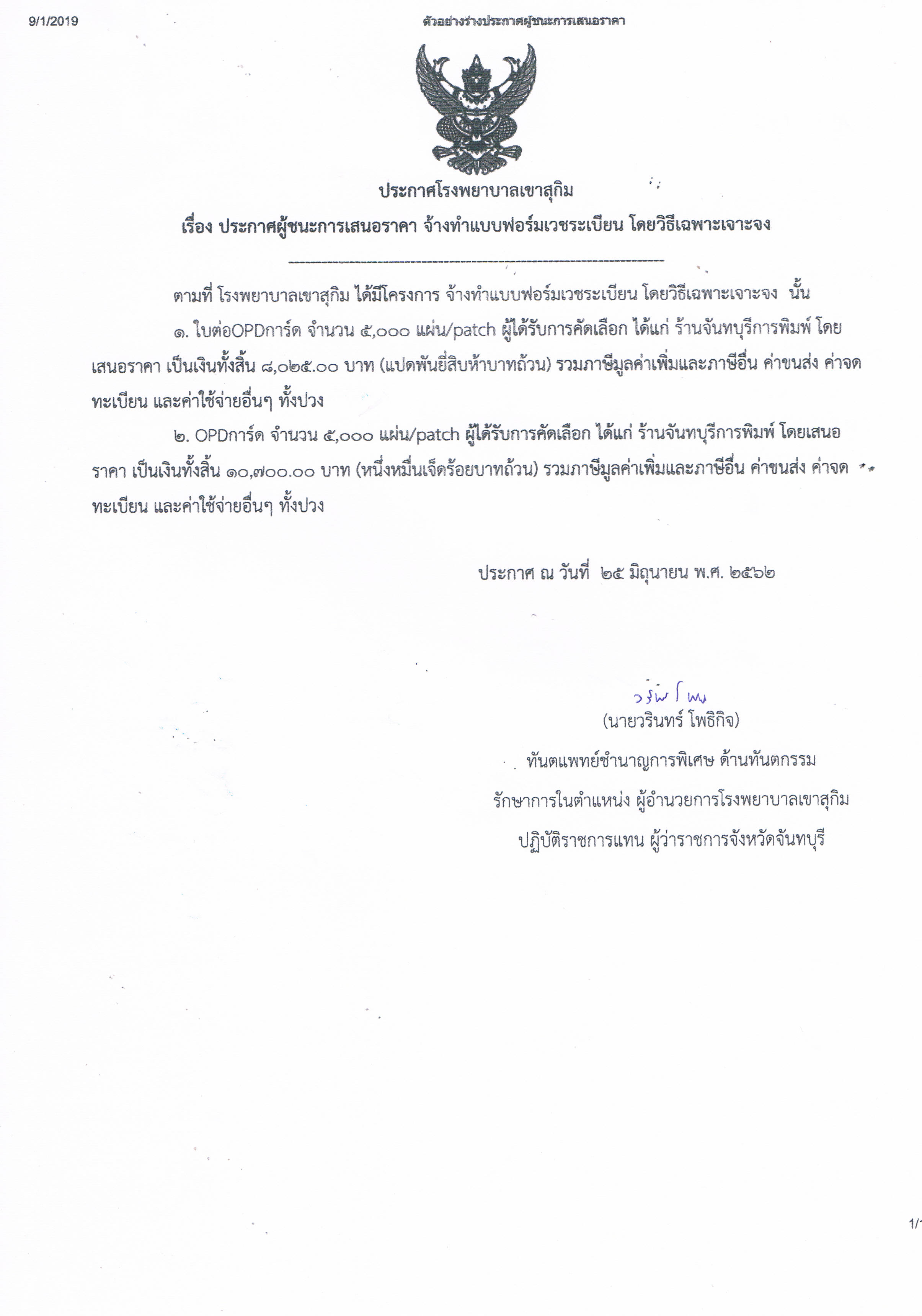 09 Sep 2019 ประกาศผู้ชนะการเสนอราคา จ้างทำแบบฟอร์มเวชระเบียน Attachments: จ้างทำแบบฟอร์มเวชระเบียน.jpg[ ]473 kB